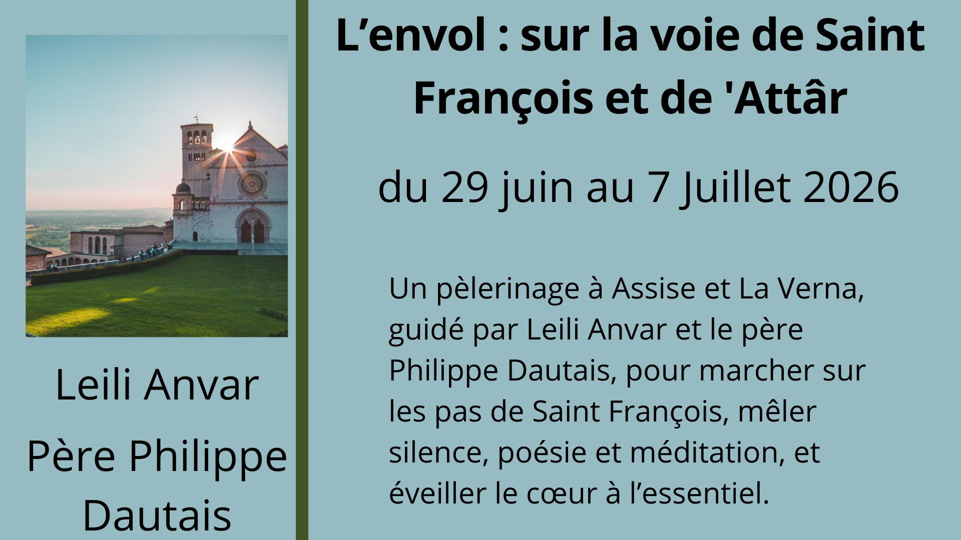 Assise ITALIE Assise, ItalyPartez pour un voyage intérieur et spirituel unique à Assise, sur les pas de Saint François et de Faridoddin ‘Attâr, guidés par deux voix inspirantes : Leili Anvar, spécialiste des mystiques de l’Orient, et le père Philippe Dautais, prêtre orthodoxe et enseignant reconnu.